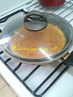 - Tuangkan bancuhan telur ke dalam kuali.Guna api yang perlahan,Tutup kuali dgn penutupnya.